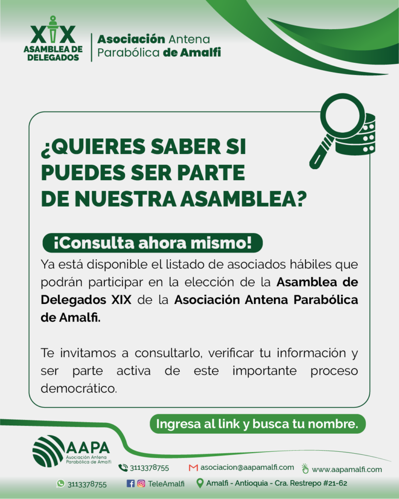 Somos una empresa sin ánimo de lucro que se fundó en el municipio de Amalfi, contamos con una trayectoria de más de 25 años en la prestación de servicio de televisión por cable y en el año 2018 innovamos para el beneficio de nuestros asociados y comunidad con la prestación del servicio de conexión a internet de alta calidad. La Asociación Antena Parabólica de Amalfi está al beneficio de todos los amalfitanos y agradecemos a cada uno de nuestros asociados, porque gracias a ustedes seguimos creciendo para mejorar la calidad de vida de nuestra comunidad Amalfitana.